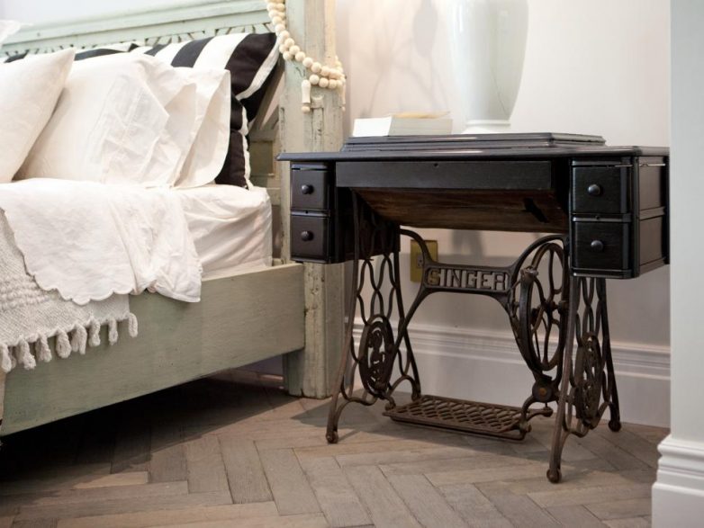 Смешивая старый и новый стили, вы можете сохранить свою спальню от устаревшего вида и сделать свой собственный дизайн. В этой комнате уникальная тумбочка с подставкой Singer подчеркивает великолепный пол с рисунком в елочку и мятную кровать.