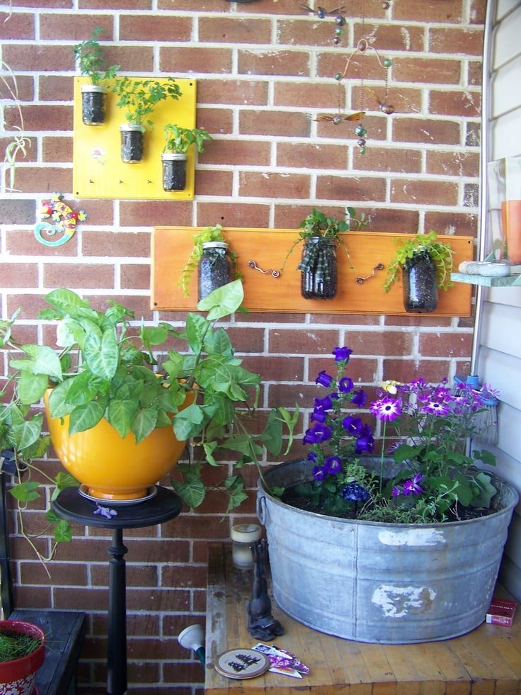 Для оформления сада на балконе, используйте необычные горшки для посадки цветов: алюминиевый таз или стеклянные банки создают особую деревенскую атмосферу.