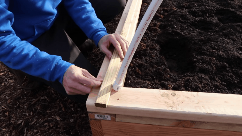 Количество материалов напрямую зависит от размеров грядки. Сделав замеры короба грядки, подготавливаем доски для основания купола. Крепить их между собой удобнее по косой с внешней и внутренней стороны.