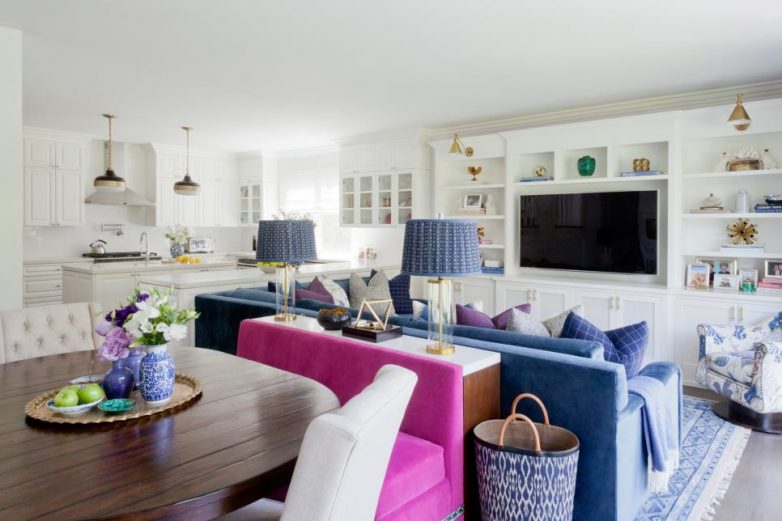 Фиолетово-голубые оттенки сделают интерьер комнаты ещё более стильным и привлекательным. Яркая фуксия подчеркнёт отдельные элементы декора.