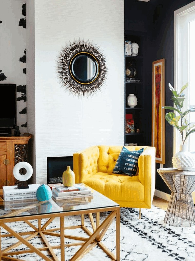 Ярко-синие и жёлтые оттенки создают идеальную комбинацию, тем самым делая интерьер более стильным и современным. Этот дуэт выглядит особенно потрясающе в сочетании с нейтральными тонами, такими как чёрный и белый.