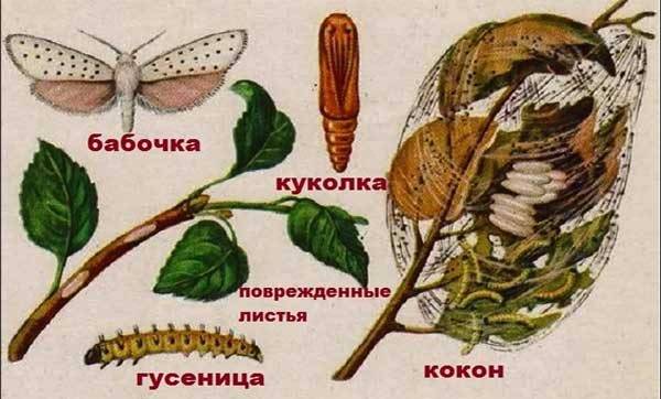 Выходя из яйца гусеница остается зимовать под влагонепроницаемым щитком на тонких ветвях. Весной, во 2-й половине апреля гусеницы моли выходят из зимовки, вгрызаются в листья, проделывая в них узкие ходы, оставляя нетронутой верхнюю и нижнюю кожицу. Во время цветения начинают объедать листья, оплетают их паутиной и образуют из них гнезда, из-за этого листья яблонь скручиваются, буреют и опадают. При массовом заражении такими гнездами может быть усыпано все дерево. Бабочки откладывают около 100 яиц.