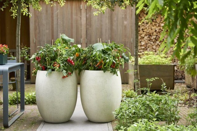 В высоких керамических горшках овощные культуры будут органично и эффектно смотреться весь сезон, с весны до самой осени. Овощи можно высадить в емкости, похожие на вазы, вместо сезонных цветов. Белый цвет придает высокой керамике строгий и элегантный вид.