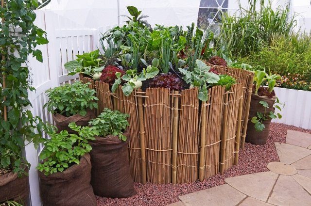 Высокий огород визуально увеличивает маленькое пространство. Для устройства высоких грядок вместо камня или бетона можно использовать натуральные материалы, например, соломенные коврики. В роли горшков тут выступают мешки из джутового волокна. Только, к сожалению, из-за небольшой их прочности такого мини-огорода хватит всего на один-два сезона.