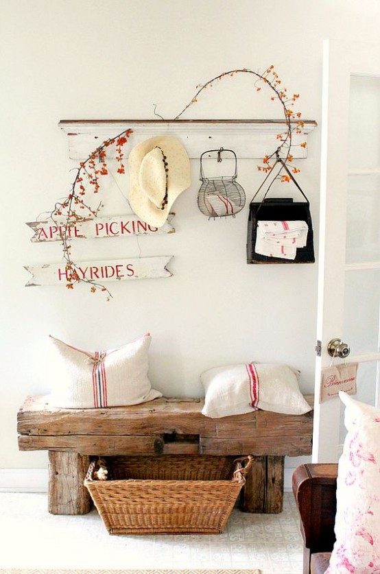 В деревенском стиле выполнена шикарная прихожая с деревянной скамейкой, вывесками, полкой и корзиной для хранения.