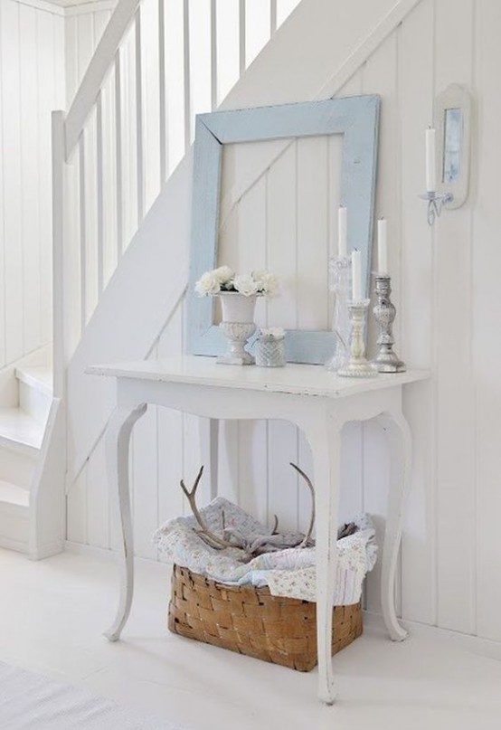 Шикарный изношенный стиль требует шикарного декора, а некоторые произведения искусства, зеркала и милые подушки — именно то, что вам нужно. Выберите потрепанный текстиль в горошек и полоску, а также не совершенную отделку, чтобы придать пространству изношенный, но очень гостеприимный вид.Нейтрального стиля побеленная шикарная прихожая с пастельной мебелью — стул, консоль, полка, коробка с цветами и корзина.