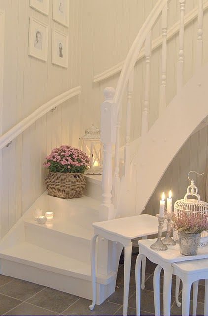 Белая побеленная прихожая с тумбочками, свечами, клеткой и цветками в горшках.