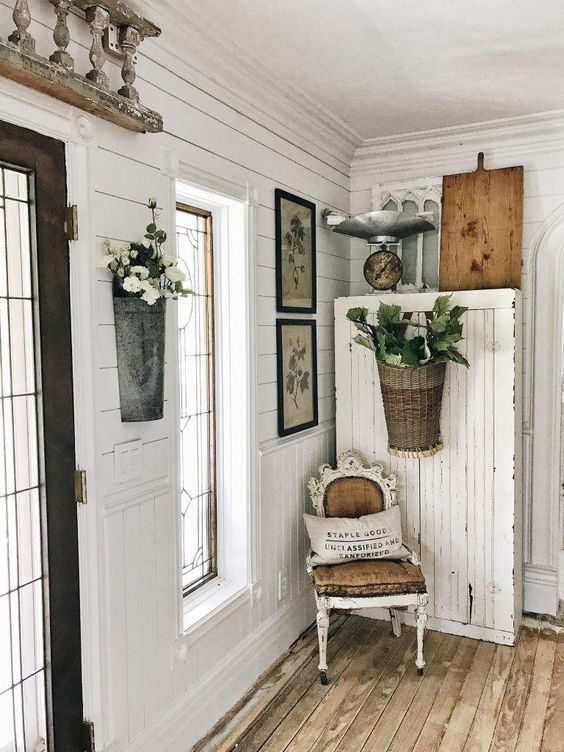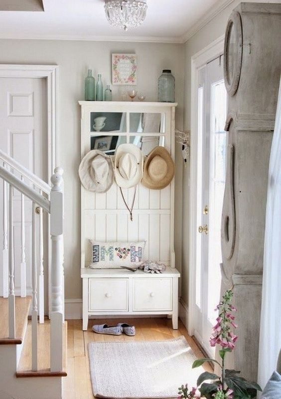 Побеленный шик редко используется в качестве единственного стиля, обычно к нему добавляются штрихи из других стилей. Это, как правило, сельский дом, деревенский, винтажный, поскольку они придают очарования и уюта пространству. Что касается цветов, вы можете выбрать нейтральные и пастельные тона, которые являются традиционными для побеленного стиля и украшают пространство натуральным деревом и свежей зеленью в горшочках. Сочетайте декорации с побеленными шикарными узорами, такими как полоски, цветы и горошек, все выполнено в нейтральных и пастельных тонах.Простой побеленный шикарный коридор с вешалками для одежды и подставкой, скамейкой, фонарями в виде свечей и корзиной для хранения.