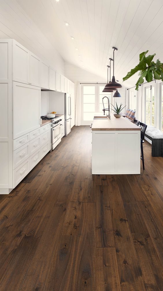 Твердые, блестящие паркетные полы обеспечивают классический, элегантный внешний вид и могут быть куплены по доступной цене. Ламинат — прекрасный вариант, но не забудьте купить лучший на рынке ламинат, чтобы обеспечить его неизменно высокое качество. Кроме того, подумайте о выборе темного цвета для более роскошного внешнего вида, но обязательно добавьте несколько ковриков, чтобы связать общий дизайн комнаты от пола до потолка.Уютная кухня с паркетным полом и темной мебелью выглядит очень гостеприимно и стильно.
