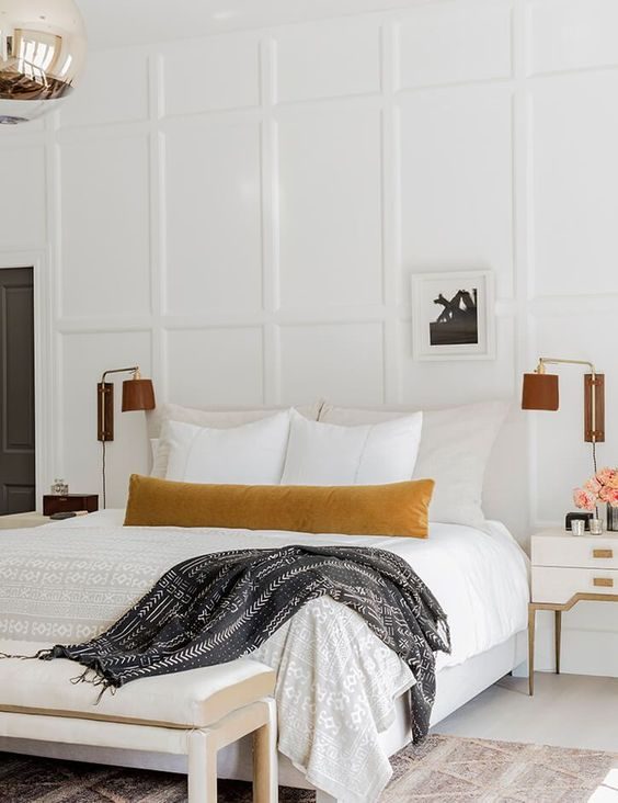 Цвет краски — это, пожалуй, одно из самых сложных решений при оформлении комнат, особенно когда остальной декор будет основан на цветовой палитре. Выберите один из этих двух вариантов цвета: насыщенный и драматический или мягкий, сдержанный оттенок.Нейтральная спальня с панелями, шикарная нейтральная мебель, элегантные кожаные бра и коврик с принтом выглядят гостеприимно.