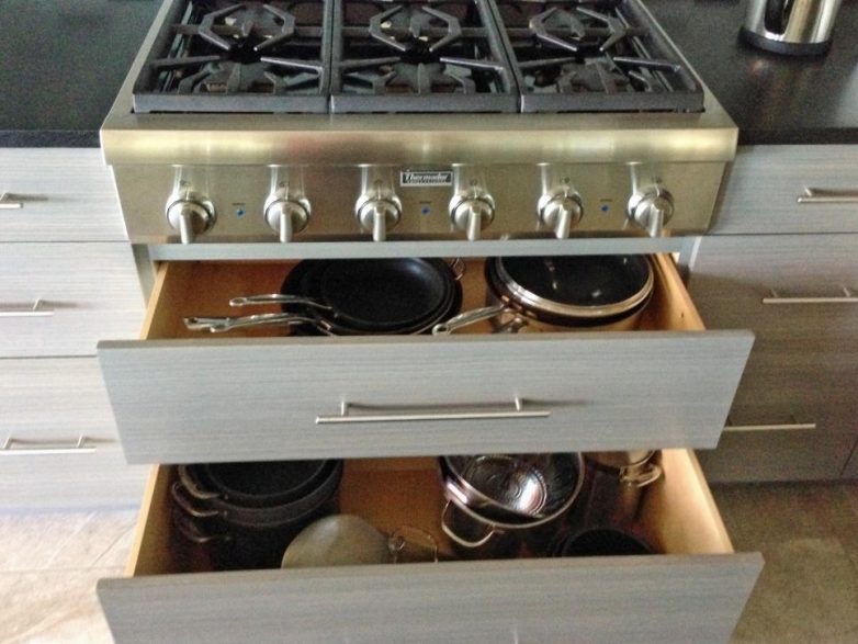 На кухне храните все ваши кастрюли и сковородки в ящике непосредственно под плитой, а инструменты — в ящики рядом с плитой, чтобы облегчить приготовление пищи.