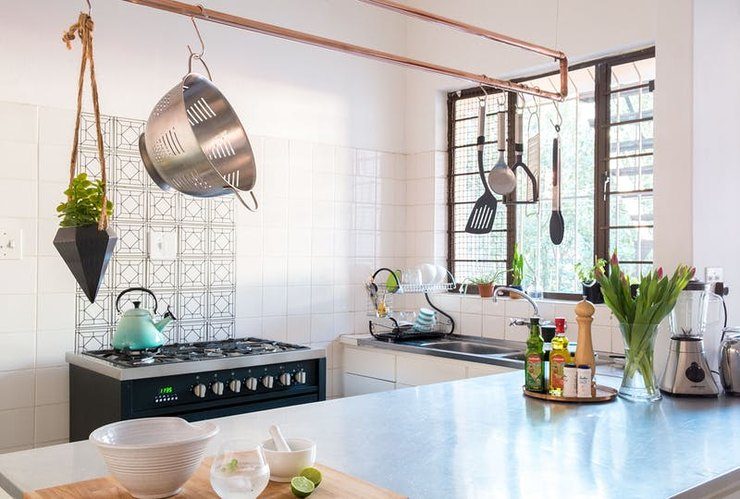 Когда речь заходит о небольшой кухне, поднимаем голову вверх и используем как можно рациональнее настенное и потолочное пространство.Рейлинг для кухонной утвари