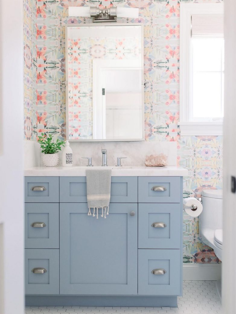 Дизайнеры Ли Линкольн и Эли Морфорд добились баланса в интерьере в ванной комнате. В интерьере сочетаются обои с причудливыми узорами с туалетным столиком в пастельных серо-голубых тонах с атласными никелевыми ручками.
