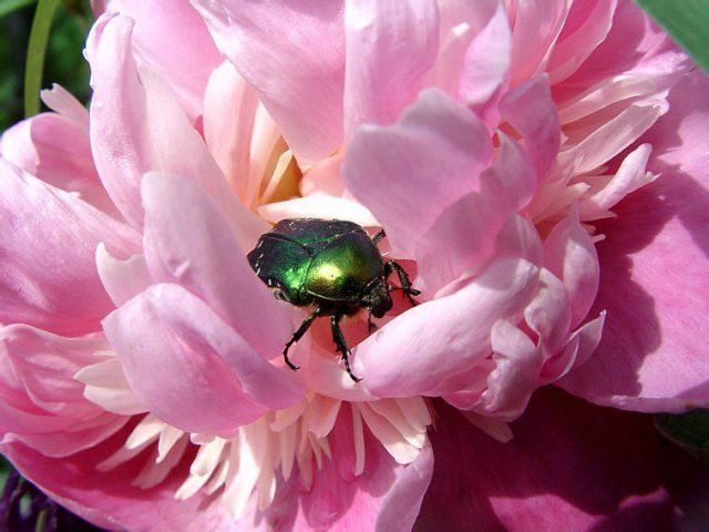 Этот жук с золотисто-желтой спинкой особенно опасен с мая по август. Он объедает лепестки, стебли и листья пионов.