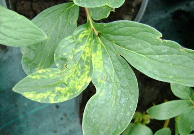 Это вирусное заболевание проявляется пятнами на листьях пионов. При кольцевой мозаике листовые пластины растений покрываются светло-зелеными полосами, чередующимися с темно-зелеными, которые тем самым создают мозаичный рисунок. Также при этой болезни на листьях пионов могут появляться некротические пятна небольших размеров.