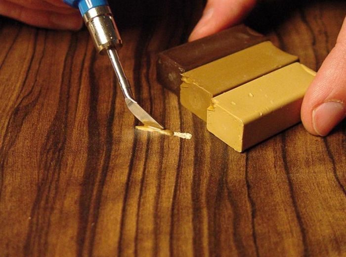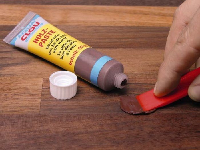 В магазинах строительных материалов можно наткнуться на шпатлевку по дереву. Ее также можно использовать в качестве затирки для устранения царапин и прочих дефектов на ламинате. Технология работы уже должна быть знакома по описанию двух предыдущих вариантов. Все тот же шпатель и малярная лента.