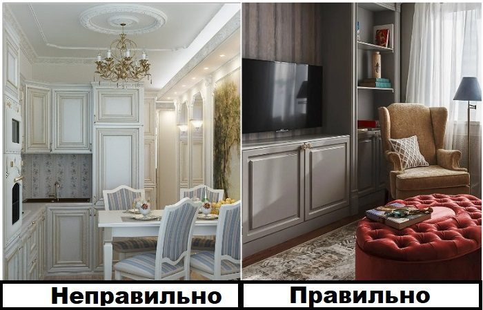 Больше всего ошибок дизайнеры совершают при оформлении квартиры в классическом стиле. Все помнят, что классика нуждается в пространстве и большой площади, а вот о том, что она еще и требует чувства меры, часто забывают. В результате в квартире появляется много рыжей древесины, лепнины, вычурных элементов. Очень важно, чтобы все детали интерьера складывались в деликатную, гармоничную, целостную картинку, а не вызывали ассоциации с квартирой пожилой пары. Старайтесь соблюдать баланс и не перегибать, особенно с декором, иначе жилье рискует превратиться в аналог Версаля.