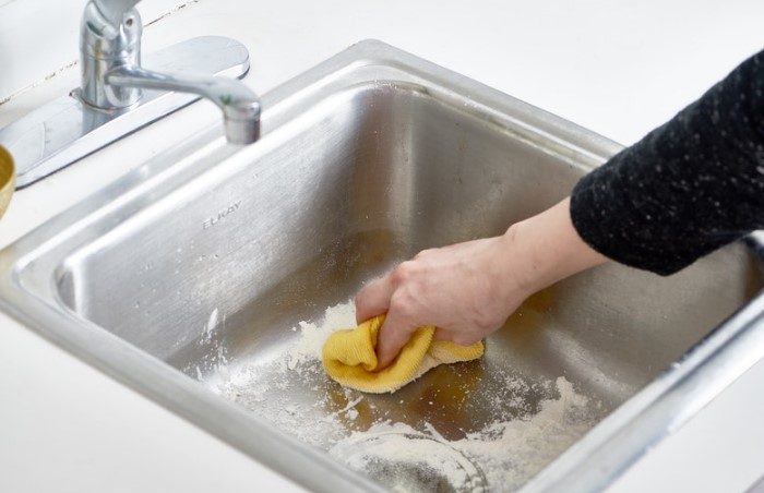 5. Вооружитесь одноразовым полотенцем или сухой жесткой губкой и в течение нескольких минут тщательно натирайте мойку. Если мука приобрела серовато-грязный оттенок, вы на верном пути.