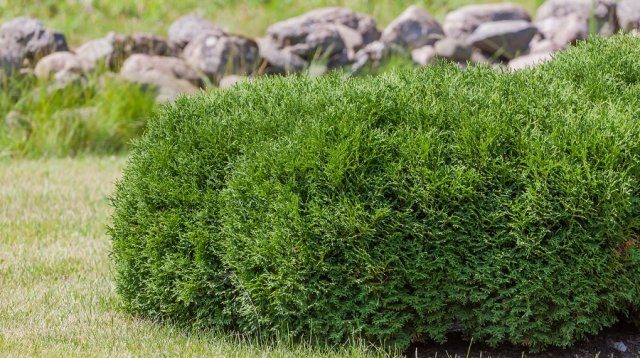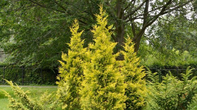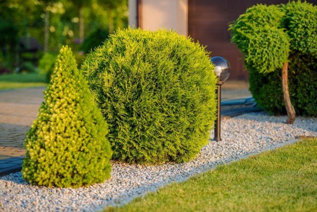 «Сама по себе» туя может стать отличным акцентом-солитером на любой садовой площадке и газоне. Идеально, когда это растение будет контрастировать по цвету и форме с окружающими посадками.