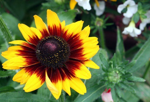 Это засухоустойчивое растение цветет в течение всего лета цветками разного оттенка. Чаще всего в наших садах встречается рудбекия с желтыми бутонами, но бывают сорта и с розовыми, красными, белыми, оранжевыми и фиолетовыми цветками. На клумбе они смотрятся очень нарядно, даже удивительно, что это растение настолько неприхотливо. А все потому, что тонкие листья и лепестки сводят к минимуму испарение влаги, и цветок всегда выглядит свежим.