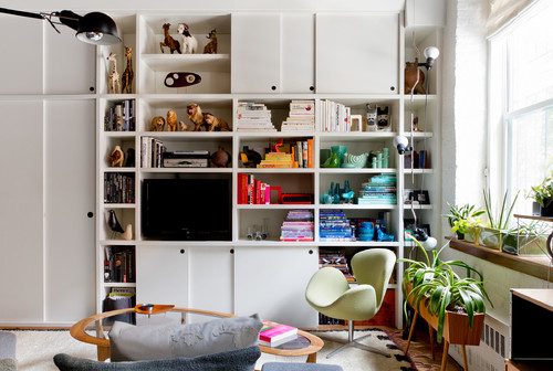 Порой, уборка — самый простой и эффективный способ придать стеллажу новый вид. Принцип «верха и низа» работает и здесь. Главное, чтобы порядок был на тех полках, которые находятся на уровне глаз. В организации и красивом хранении вещей помогут коробки и корзины; сюда можно сложить и книги, которые вы давно прочитали, и безделушки, на которые надоело любоваться.