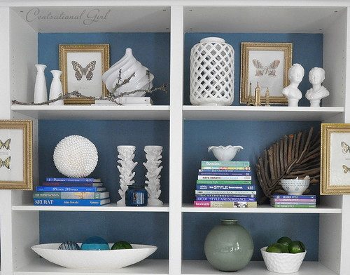 Используйте композиционный прием: правило треугольника. Он часто используется в фотографии, но и и при расстановке вещей на стеллаже будет полезен. Ставьте предметы так, чтобы они, если провести линии взглядом, были вершинами треугольника. В примере на фото — это синие вазы. Треугольники могут быть любых размеров и форм, они могут строиться за счет перекликающихся цветов, форм, фактур, и могут визуально пересекать друг друга.