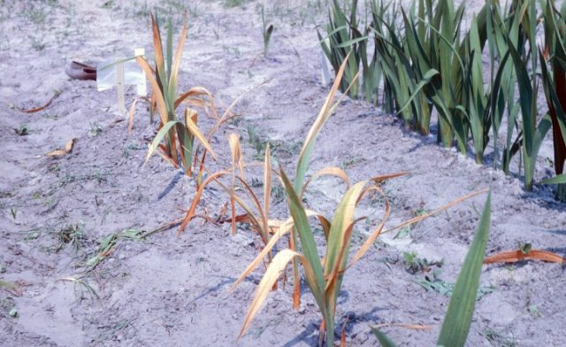 Плохо растут корни и листья, надземные части растения искривляются, сохнут и желтеют (начиная с нижних листьев), клубнелуковицы покрываются сухими красно-бурыми пятнышками, как бы вдавленными внутрь и загнивают при хранении.