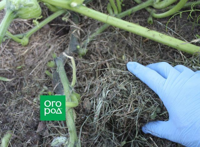 Мульчирование земли помогает удерживать влагу, задерживает рост сорняков и улучшает структуру почвы, поскольку под слоем мульчи отлично развиваются полезные бактерии. Чтобы растущие плоды тыквы и нижние листья меньше контактировали с влажной землей, слой мульчи нужно время от времени обновлять.