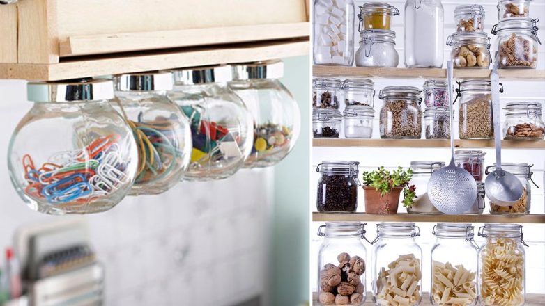 Если у тебя маленькая кухня, держи лайфхак для хранения. Приклей стеклянные банки с жестяными крышками к нижней части навесного шкафчика. Так ты сможешь хранить больше вещей, не занимая много места.
