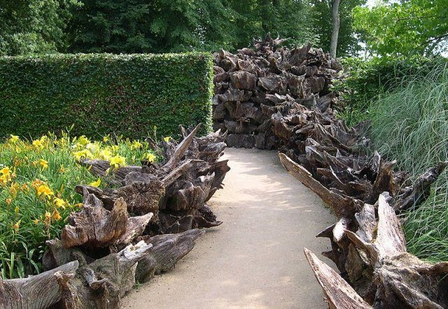 Композиции-стампери могут быть цельными и одиночными, образуя, как мы уже писали, подобие рокария, только не из камней, а из дерева. Могут быть вытянуты горизонтально, к примеру, обрамляя садовые дорожки, а могут устремляться вертикально ввысь, формируя стилизованные стены и арки.
