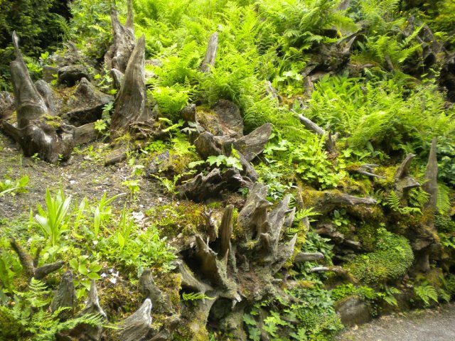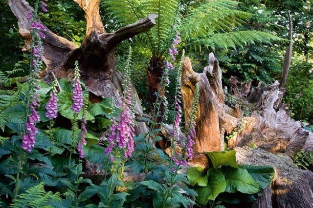 Разумеется, все эти «деревяшки» не должны просто лежать на песке посреди вашего участка. А должны быть художественно оформлены в подобие альпийской горки в окружении подходящих растений – чаще всего для этих целей рекомендуют папоротники (именно экзотическими папоротниками неимоверно увлекались садоводы викторианской эпохи). Также в «классическом стампери» широко используют мхи, хосты, морозники, молочаи, лишайники, различные эпифиты, т.е. растения, ассоциирующиеся у нас с мрачными тенистыми местами в старом лесу.