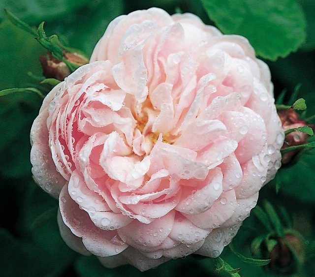 Цветки густомахровые, розетковидные, 5-8 см в диаметре, по 3-5 на стебле. Цветение однократное, но очень обильное. Цветки бледно-розовые, при полном распускании сильно светлеют. Имеют насыщенный аромат.