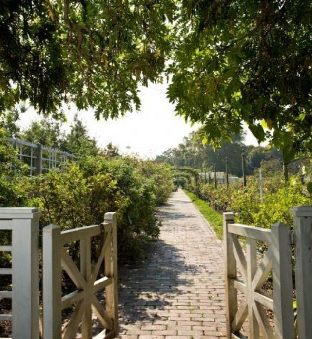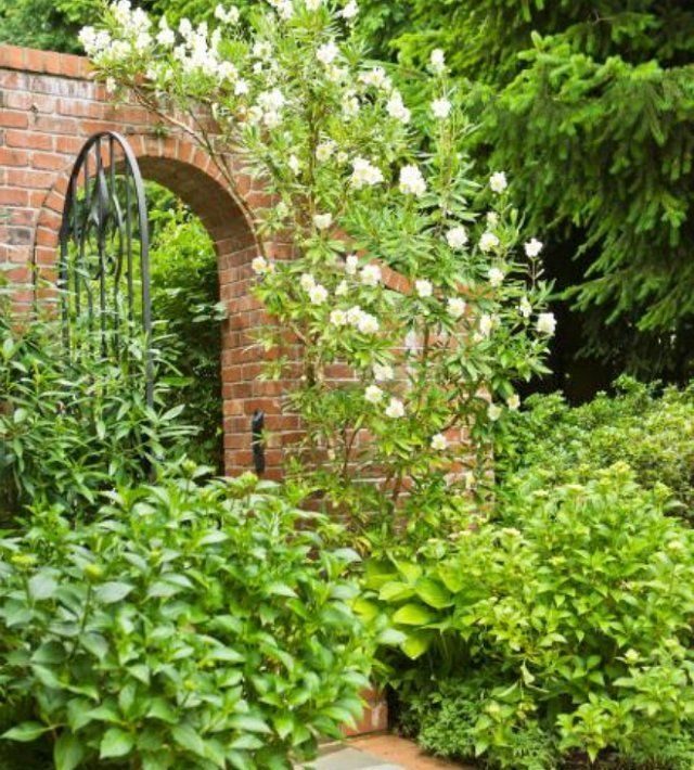 Плетистые розы, возвышающиеся над классической невысокой калиткой – это настоящая романтика. Наличие изогнутых линий добавляет этому пейзажу шарма. Обратите внимание на форму калитки на фото – ее полукруг зеркально отражает форму перголы, придавая композиции завершенность. Так и хочется заглянуть через эту арку в уютный дворик.
