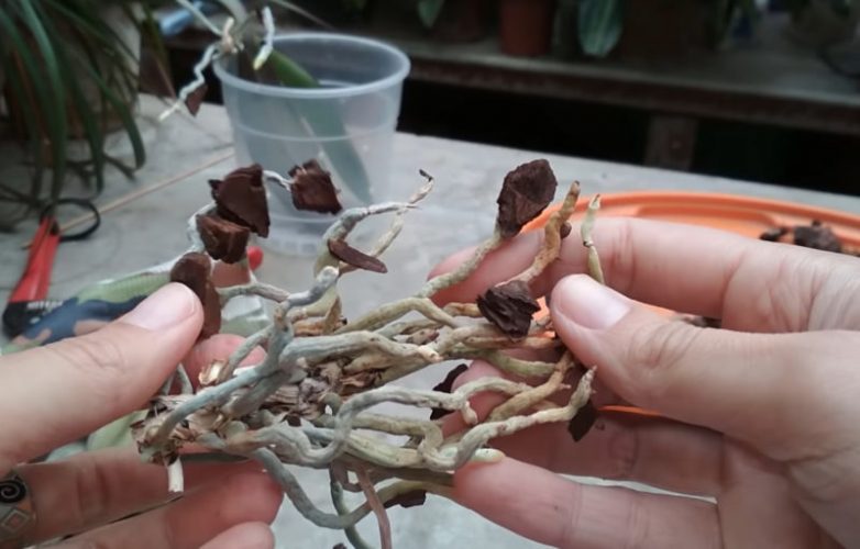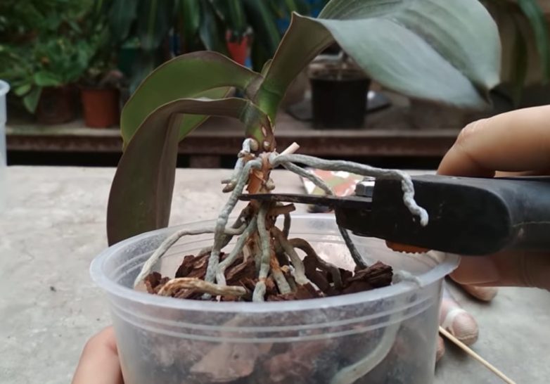 Оставшуюся после среза нижнюю часть орхидеи следует выкопать. Сухой ствол без корней необходимо обрезать секатором, а срез присыпать углем.