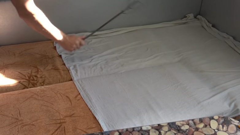 После этого возьмем большую тряпку или старую простынь и окунем в раствор воды (1 л) и уксуса 9 % (1 ст. л.). Перенесем простынь на мягкую мебель и начнем выбивать пыль.