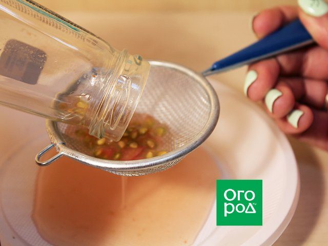 Забродившую жидкость нужно аккуратно слить вместе со всплывшими пустотелыми некачественными семенами, к оставшимся на дне семенам томата долить еще немного свежей воды, взболтать и отправить их процеживаться и стекать через ситечко.