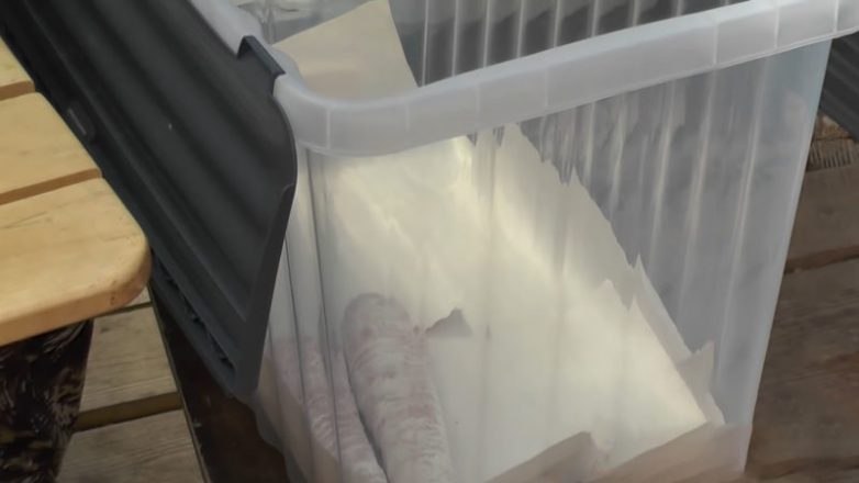 И уложите в какую-то объёмную тару с выложенной на низ бумагой. Складывайте овощи слоями один на один, накройте крышкой и храните в темном месте необходимое количество времени. Благодаря извести морковь остаётся такой же сочной и вкусной, как и летом!