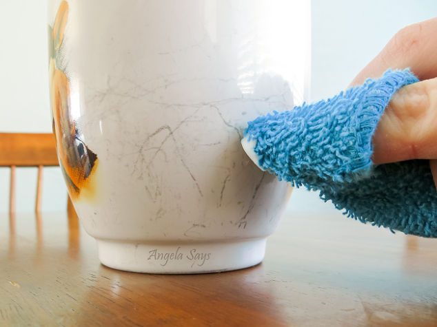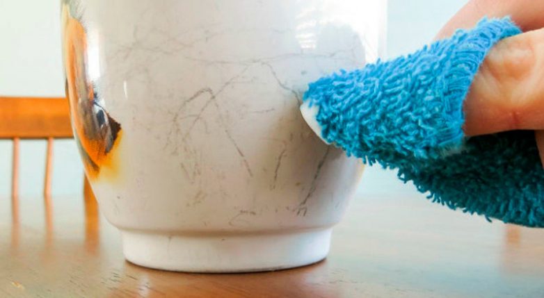 Эти полосы остаются от металлической посуды, и выглядят так, будто нарисованы на тарелках или кружках простым карандашом. Убрать их довольно просто, и уж точно не стоит из-за этого посуду выкидывать.