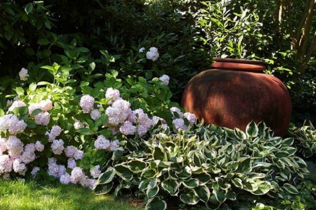 Говоря о лучших растениях, которые могли бы составить компанию гортензии, нельзя не упомянуть хосту. Каплевидные листья этой королевы тенистого сада гармонируют с листовыми пластинками большинства видов гортензий, а выразительная расцветка хосты, наоборот, создает контраст со спокойной зеленью гидрангеи. Что касается условий выращивания, то здесь у них полное совпадение. Оба растения предпочитают влажную и плодородную почву. Оба прекрасно чувствуют себя в тени. И хоста, и гортензия хорошо развиваются в слабокислом грунте. Четвертый вариант, который мы хотим вам представить, как раз и состоит из пары гортензия плюс хоста.