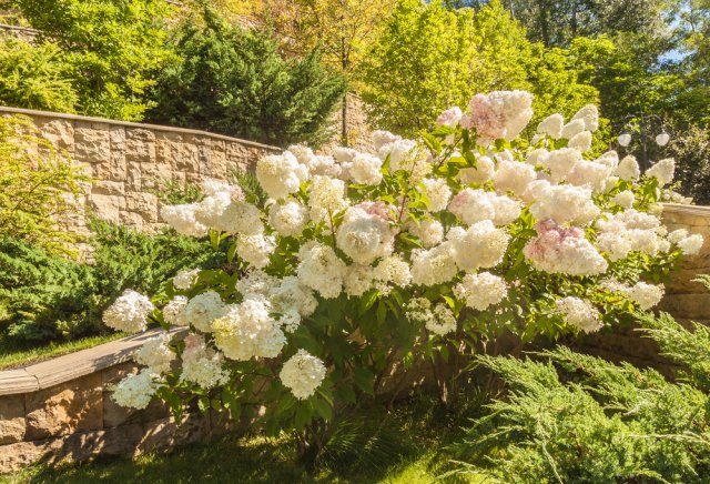 Не менее интересно смотрится вариант, где рядом с крупными кустами гортензии расположены низкорослые можжевельники (на фото). При такой посадке оба растения будут чувствовать себя комфортно, потому что одинаково любят кислую почву и легко переносят полутень.