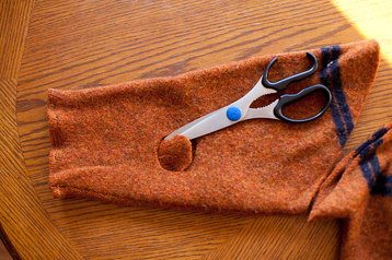 Для этого проекта нужны только ножницы. Вырезаете один рукав, проделываете отверстия для лапок и аккуратно обрабатывает край спинки. Идеальный вариант для дачи, если внезапно похолодало.
