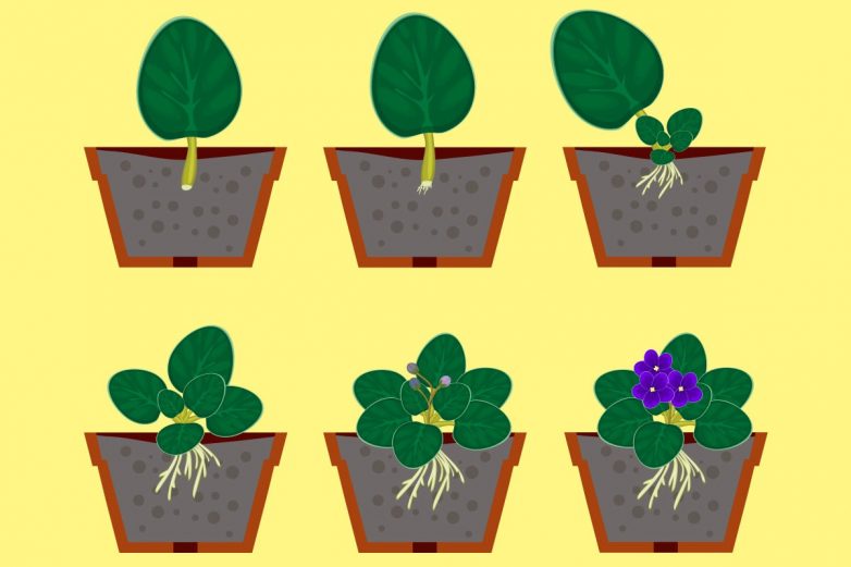 Через 1–2 месяца при правильном уходе вокруг посаженных в грунт листков появятся маленькие фиалки.