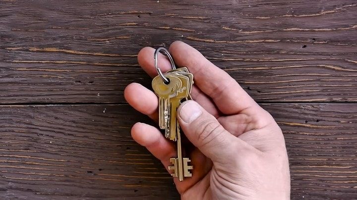 Просверлите в нём ещё одно отверстие, не по центру, и вденьте кольцо именно в него. Ключ будет всегда сам «выпадать» из связки вам в руку. Это особенно удобно, если найти его необходимо в темноте!