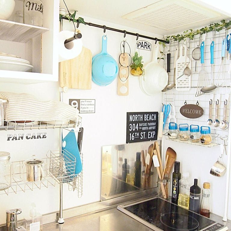 Установите узкую полку и вешалки возле плиты, чтобы все необходимые предметы были рядом
