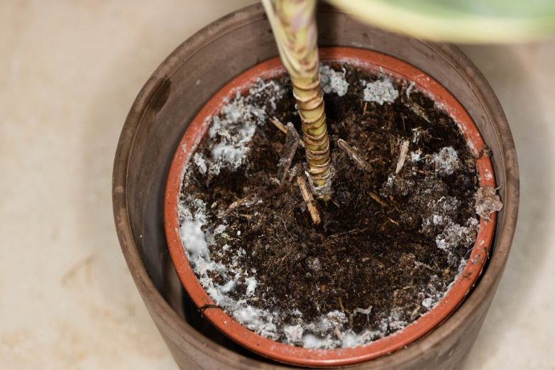 Если плесень уже появилась, нужен радикальный подход. Лучше всего полностью сменить грунт или хотя бы только верхнюю его часть. Горшок нужно тщательно вымыть раствором лимонной кислоты.