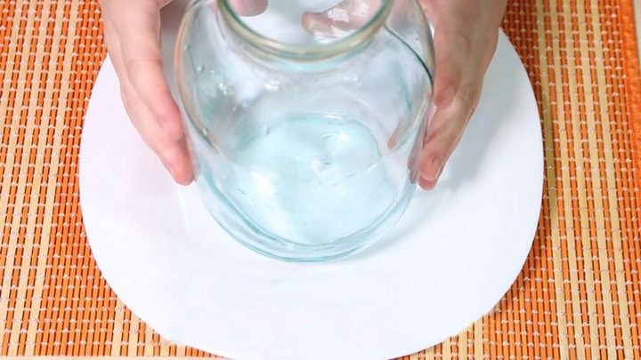 Порой стерилизовать посуду для заготовок необходимо прямо на даче или в загородном доме, где нет плиты. Многие хозяйки используют в этом случае микроволновку. Но если с небольшими баночками всё понятно, то что делать, если обработать нужно трехлитровый баллон, который не помещается по высоте? Выход очень прост: налейте на дно баллона немного воды. А затем положите его на бок на плоскую тарелку.
