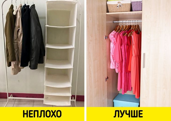 Возьмите себе за правило сразу же после улицы убирать вещи в шкаф с глаз долой. Оставляем только наряды по сезону, а все лишнее — в пакеты и далеко на полку.