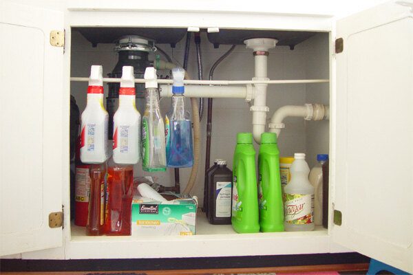 Чтобы максимально использовать пространство под кухонной мойкой, прикрутите планку для хранения средств бытовой химии, просто вешая их за рычаг пульверизатора.