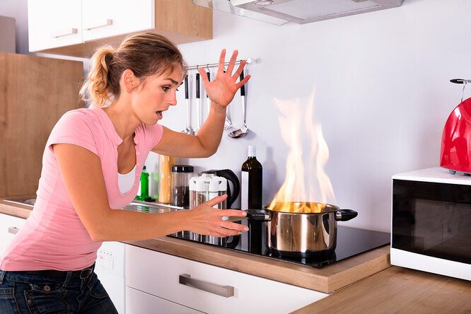 Помните, где стоит коробка с пищевой содой. Если пламя разрастается, посыпьте содой на него, она поглощает кислород и помогает потушить огонь.