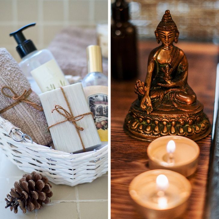 Создать приятную атмосферу помогут ароматические свечи, вазы с живыми цветами или блюдце с лепестками роз возле умывальника. В некоторых отелях ванную украшают декоративными фигурками и даже антикварными предметами. Если у вас есть симпатичная статуэтка, почему бы не сделать так же?